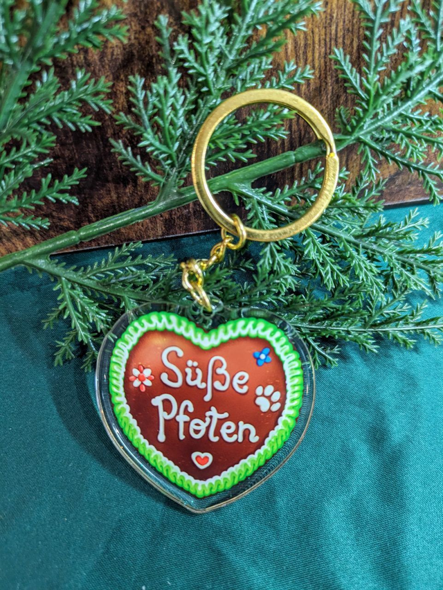 Acrylic keychain with epoxy glitters. Front with an animal with glitters and back with writing imitating the real German gingerbread cookies. Size : 5cm